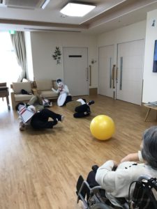 バランスボールを大きく振りかぶって、投げるその先には…