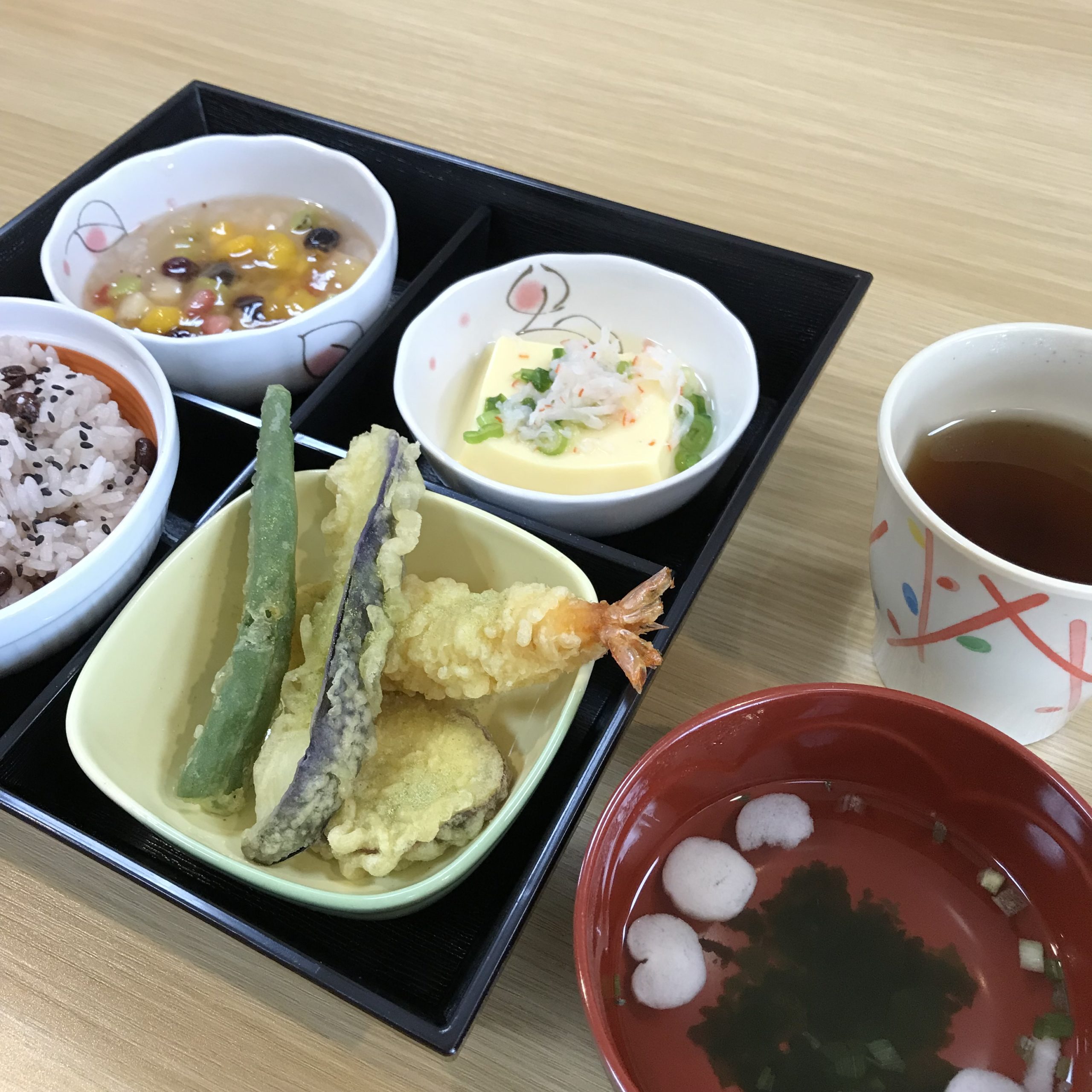 お昼ご飯は、天ぷら御膳♪ 〈 赤飯、お吸い物、天ぷら、卵豆腐、ゼリー 〉を召し上がっていただき…