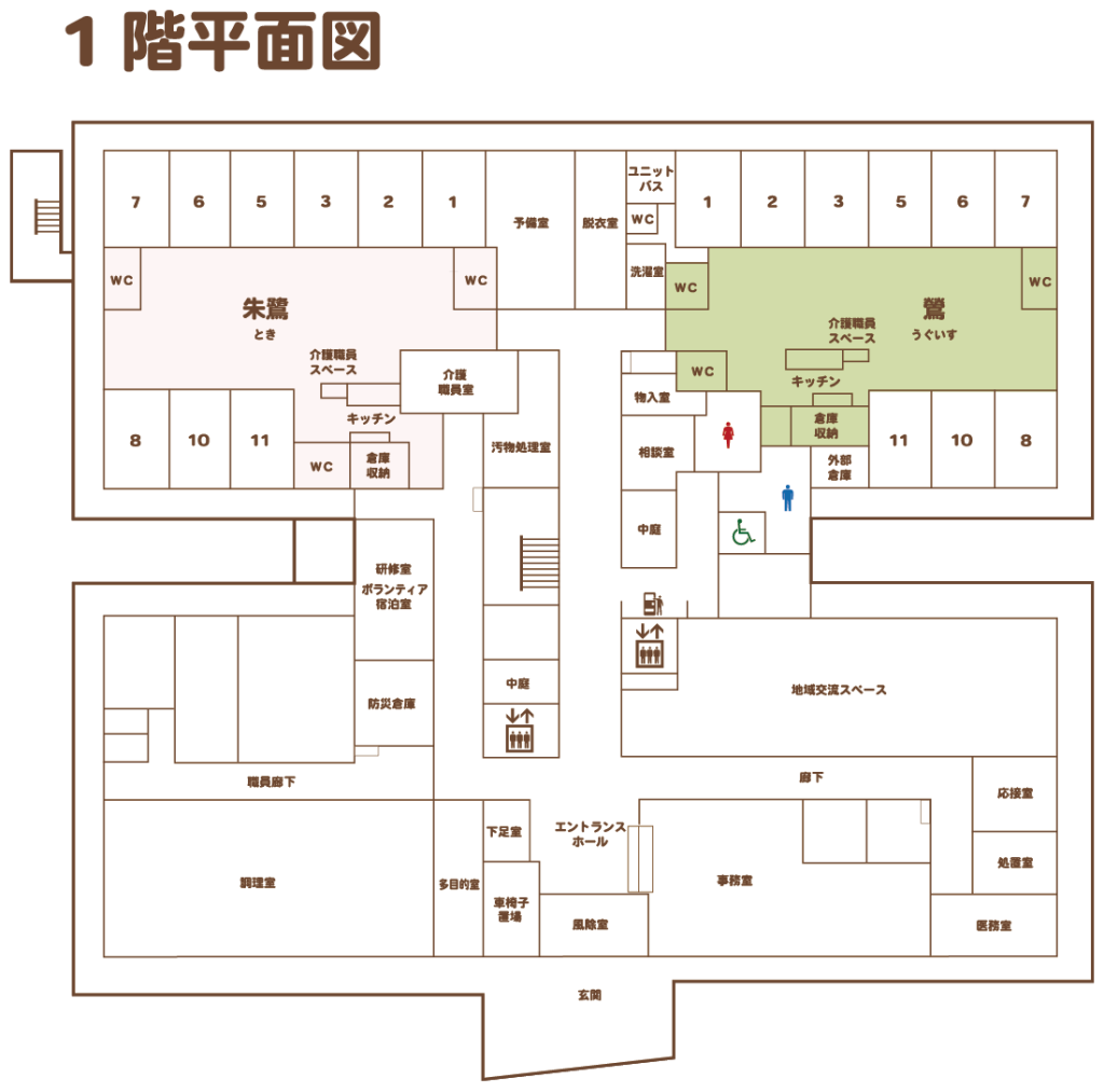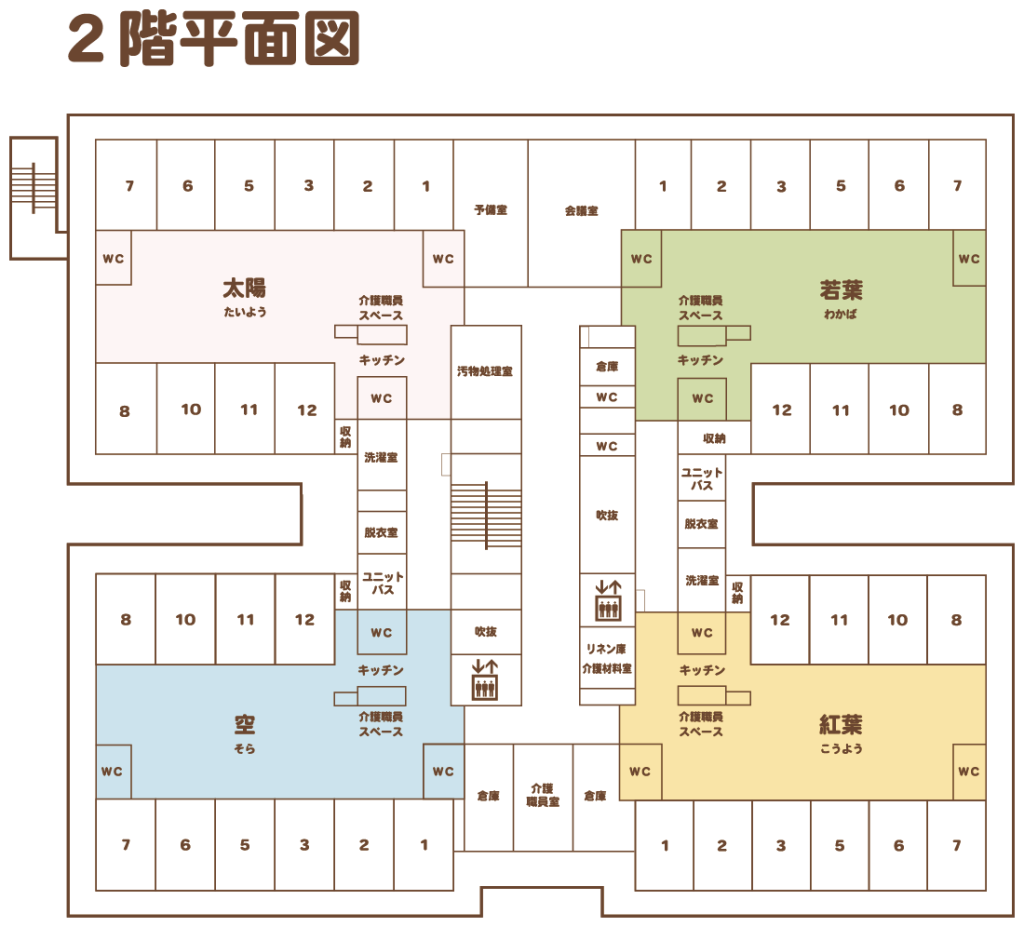 | 部屋数 | ユニット型個室 58室、従来型2人部屋 16室、ショートステイ 8室 |